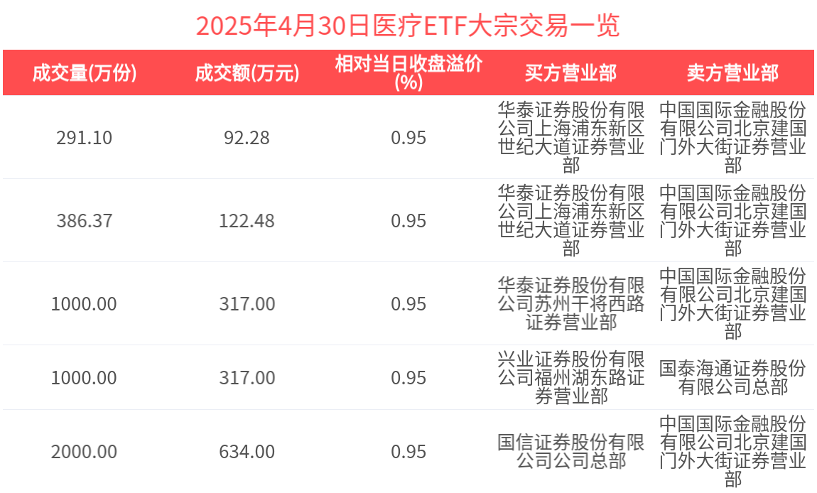 2025年4月30日,医疗ETF(512170.SH)收涨0.63%,发生5笔溢价大宗交易,成交价均为0.32元,较当日收盘价溢价0.95%。成交额分别为92.28万元,122.48万元,317.00万元,317.00万元,634.00万元,总成交额为1482.76万元,居全市场首位。